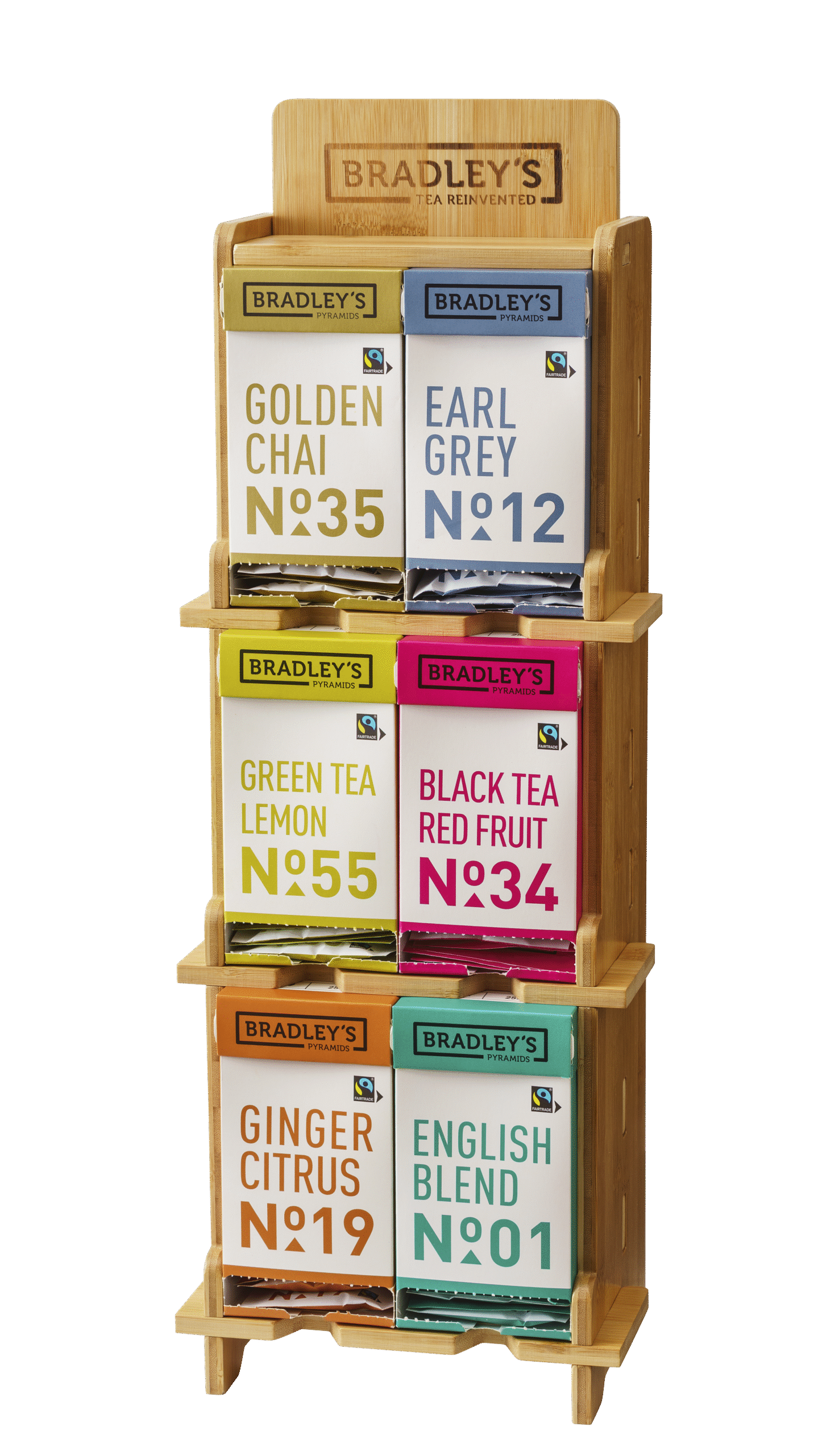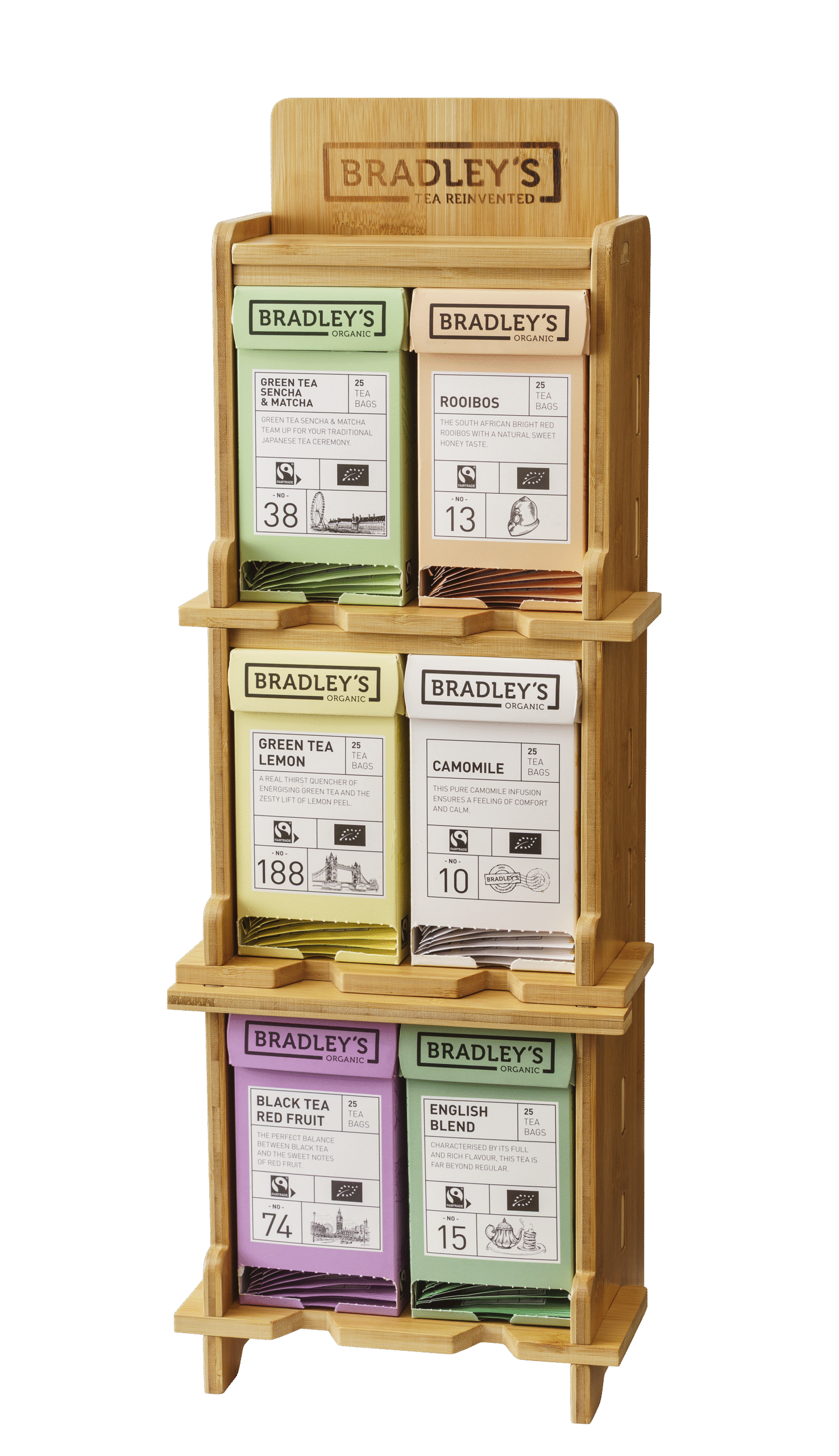 Bradley’s 6-vaks Display is perfect voor het presenteren van thee aan de bar of bij een buffet. Geschikt voor zowel de Bradley’s Organic en Pyramids lijn. De houten tussenschotjes zijn zelf te verstellen zodat of de Organic doosjes of Pyramids doosjes erin passen.